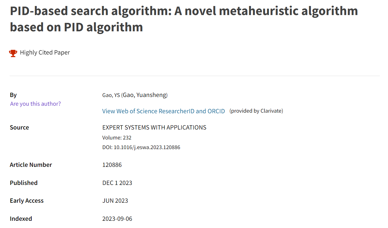 | Dec 02, 2025 | Our paper was marked as 🏆 Highly Cited Paper: PID-based search algorithm: A novel metaheuristic algorithm based on PID algorithm. |